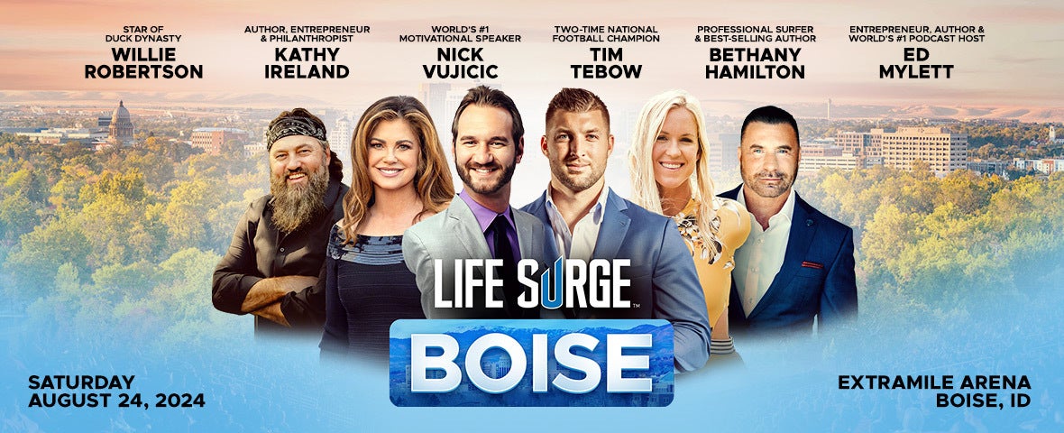 Promotional poster for "Life Surge Boise" event on August 24, 2024, at the ExtraMile Arena, Boise, ID, featuring six speakers.