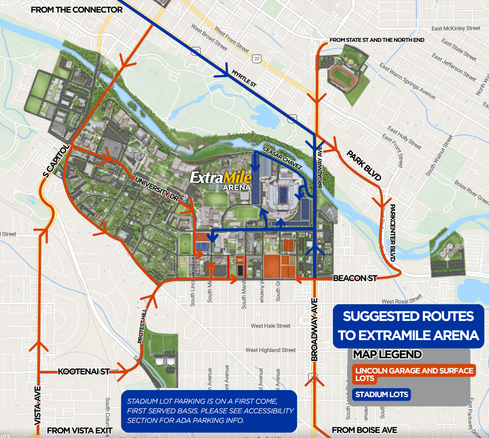 West Stadium parking lot, located between ExtraMile Arena and Albertsons Stadium, will be reserved for accessible parking for patrons and their families. Accessible parking is also available in the Lincoln Avenue Garage.